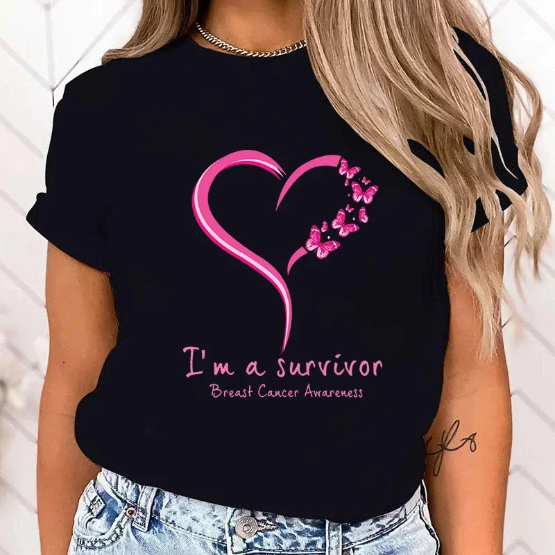 (High Quality Clothes)Breast Cancer Awareness I'M A Survivor Printed T-Shirts Women Short Sleeve Funny Round Neck Tee Shirt