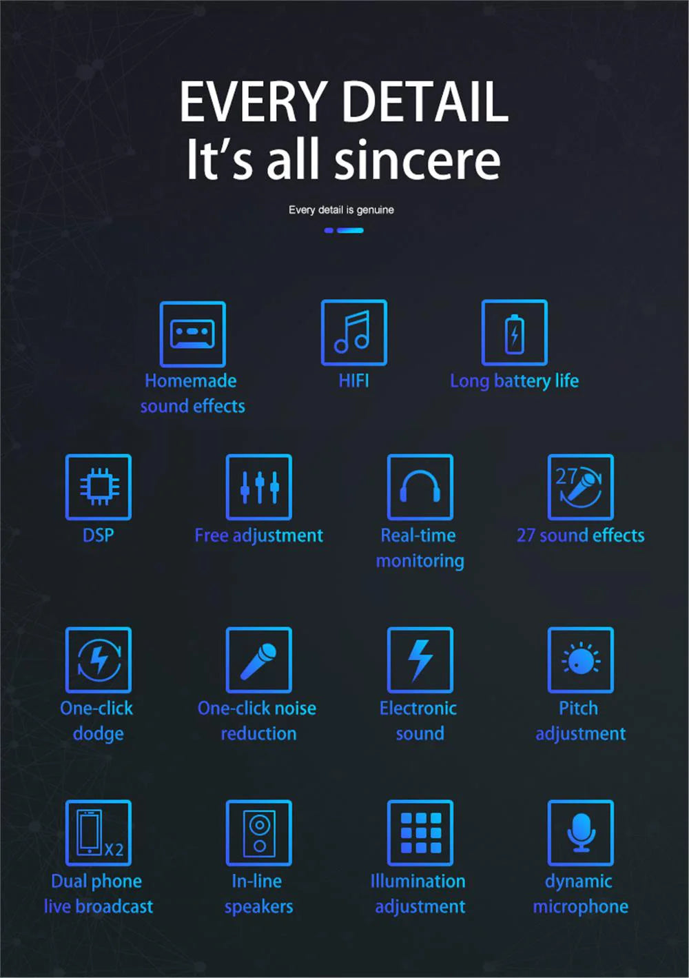 - large knob adjustment, fader adjustment, 27 kinds of sound effects, colorful lighting, dual phone live broadcast.